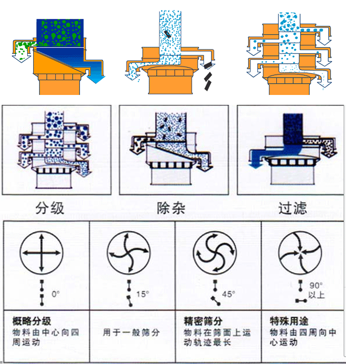不銹鋼振動篩采用YZUL立式振動電機(jī)作為激振源,通過振動電機(jī)上下兩端的偏心重錘將旋轉(zhuǎn)運動轉(zhuǎn)變?yōu)樗健⒋怪薄A斜的三次元運動,并傳遞到旋振篩的篩面上;物料通過入料口進(jìn)入設(shè)備內(nèi),根據(jù)不同物料篩分要求,物料經(jīng)過1-5層采用不同目數(shù)的金屬編織篩網(wǎng)的篩分層,在這個過程中,位于各層的篩網(wǎng)下的清網(wǎng)裝置(彈跳球)通過頻率振動不斷撞擊不銹鋼篩網(wǎng),使篩網(wǎng)上層物料能夠順暢的透網(wǎng)篩分,并有效解決了物料堵網(wǎng)問題出現(xiàn),不同目數(shù)的物料通過各層對應(yīng)目數(shù)的篩網(wǎng)后在各層的出料口排出,最終實現(xiàn)篩選除雜或過濾分級的目的。
