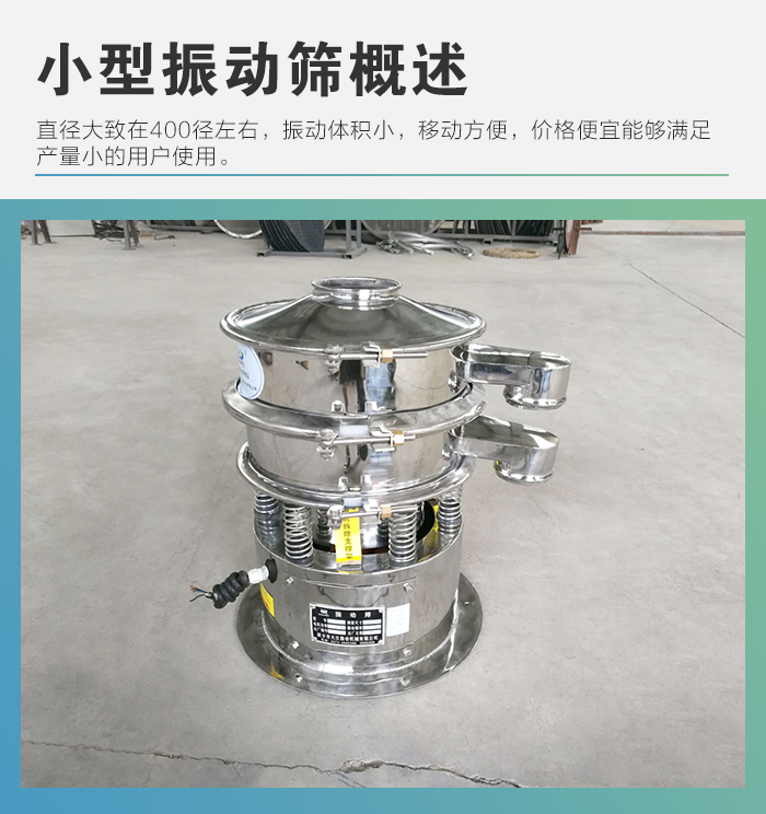 小型振動篩為400mm直徑一層兩個出口不銹鋼振動篩,整機采用304不銹鋼材質(zhì),廣泛應用于食品,醫(yī)藥,顆粒型物料的篩分行業(yè)。
