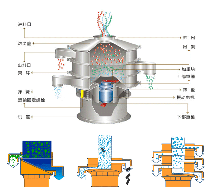 小型不銹鋼振動篩是由直立式振動電機作為激振源,電機上、下兩端安裝有偏心重錘,將電機的旋轉(zhuǎn)運動轉(zhuǎn)變?yōu)樗健⒋怪、傾斜的三次元運動,再把這個運動傳遞給篩面進行篩分。調(diào)節(jié)上、下兩端的相位角,可以改變物料在篩面上的運動軌跡。